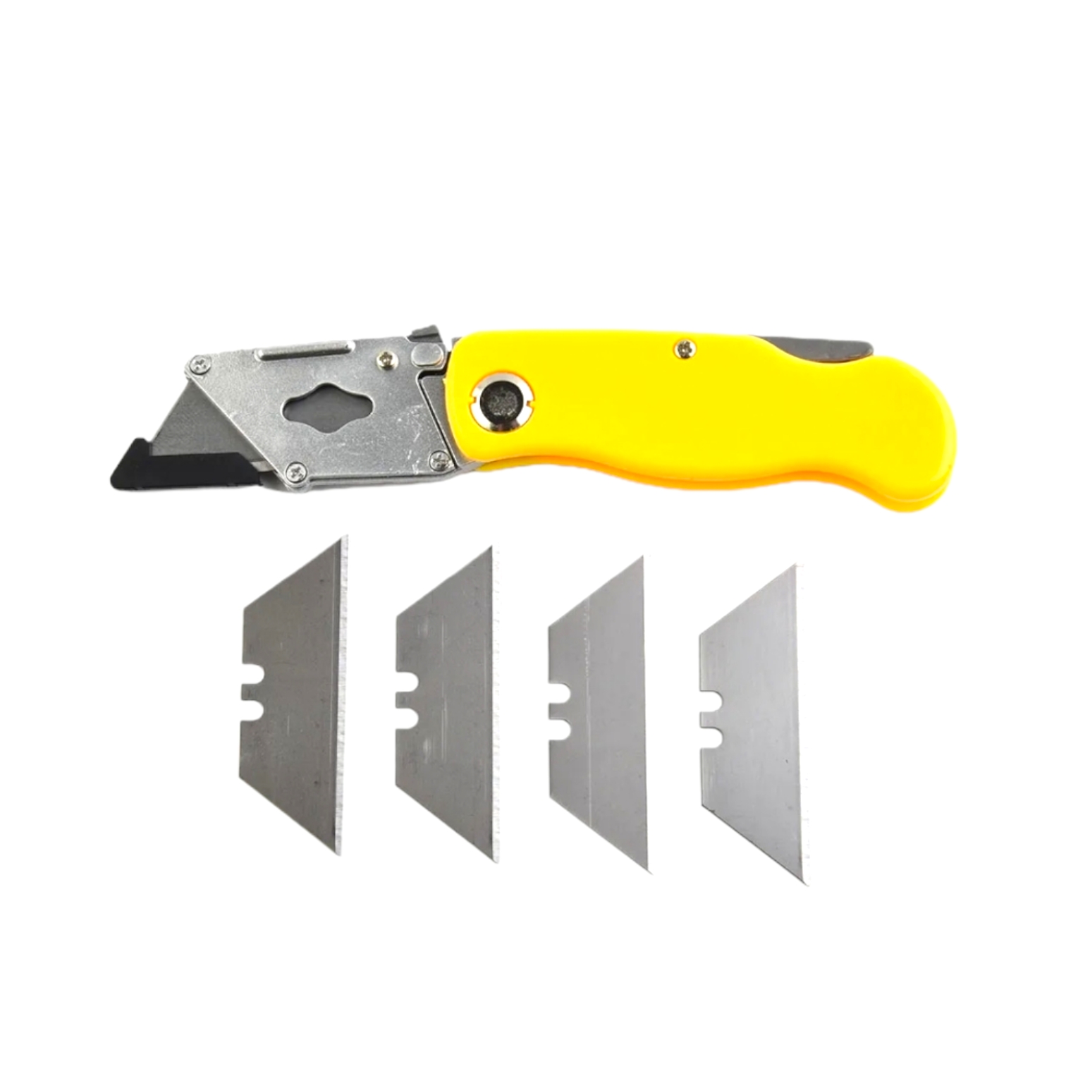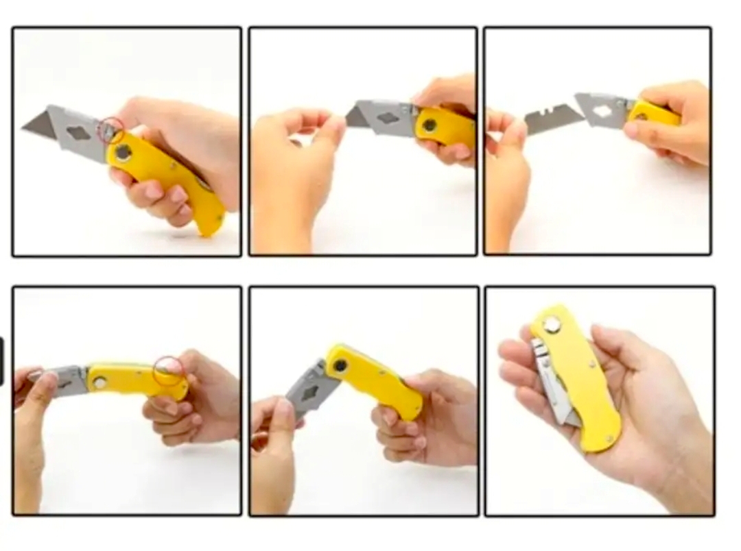 Нож по гипсокартону с запасными лезвиями — это удобный складной инструмент с рычажной кнопкой и системой Quick Change для быстрой смены лезвий.