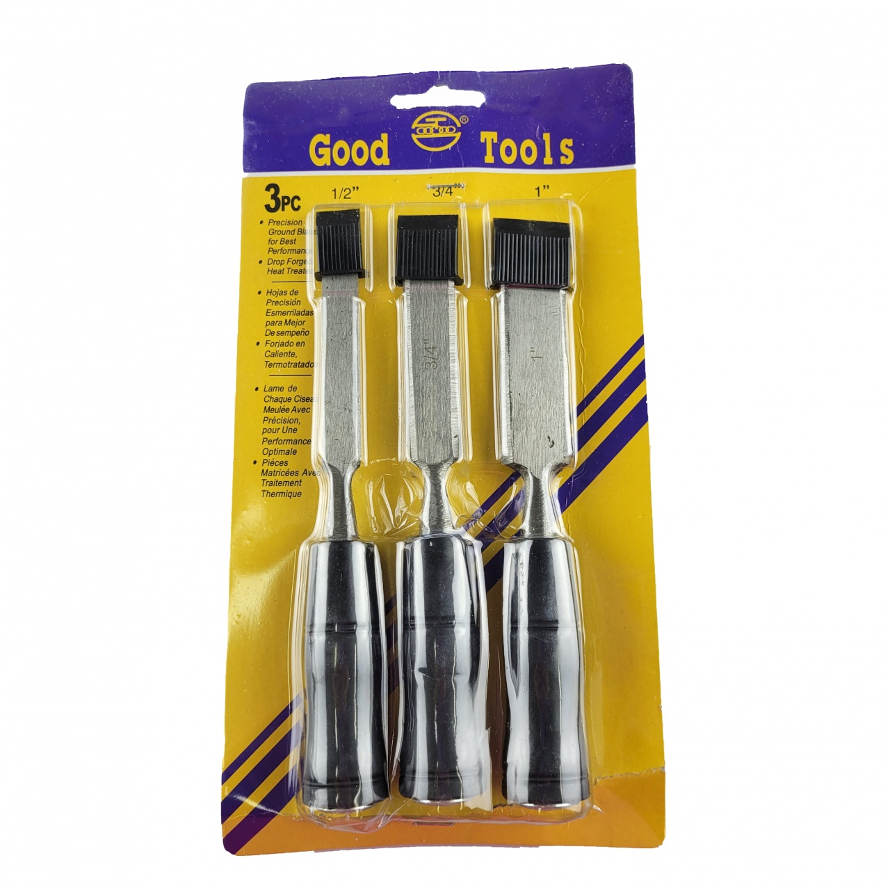Качественная заводская заточка инструментов и стальные затыльники на концах пластиковых рукояток предназначены для совместной работы со слесарным молотком.