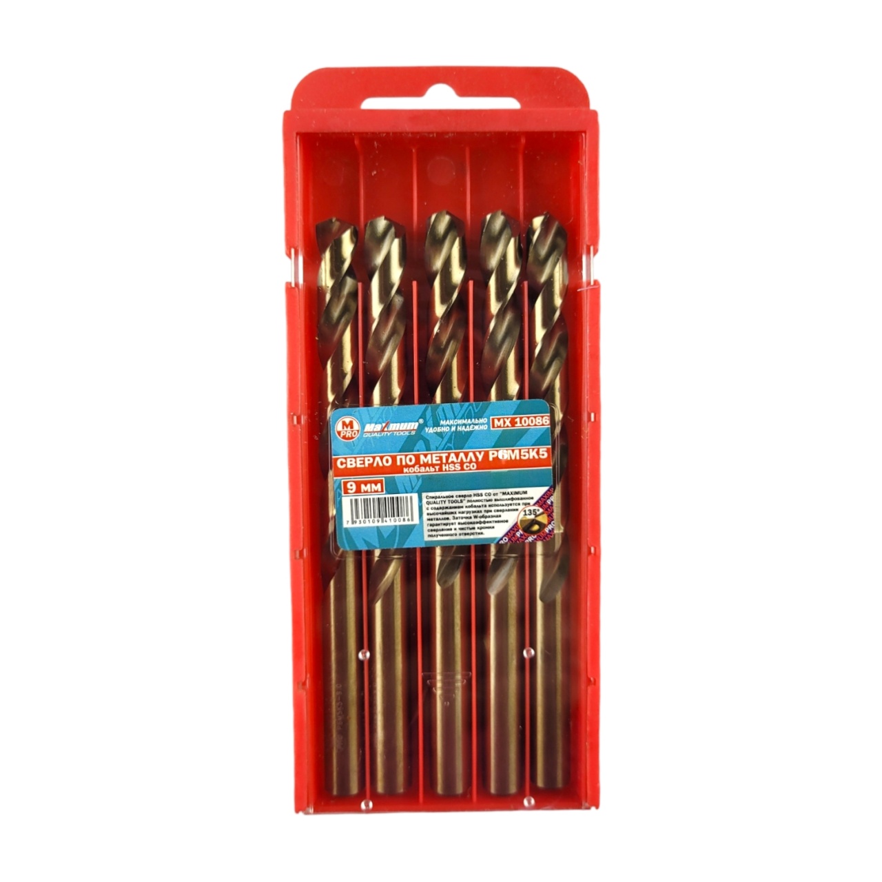 Сверло по металлу 9 мм произведено из стали Р6М5К5 с добавлением кобальта и имеет общую длину 120 мм. Набор кобальтовых сверл по металлу из 5 шт. применяется для сверления нержавейки, титана, легированных сталей, чугуна, дерева. Правосторонняя канавка имеет угол наклона спирали 34° и угол заточки 135°. Содержание кобальта в составе улучшает его прочность и износостойкость, что позволяет производить более точные и эффективные отверстия.